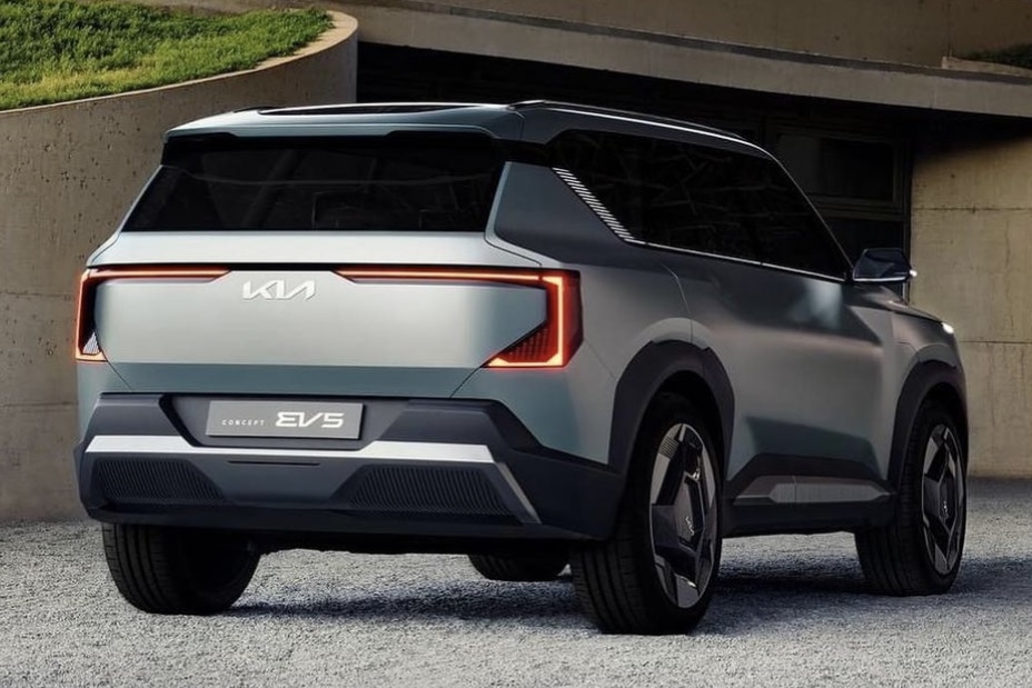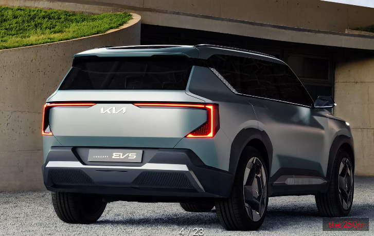 깊게 조각된 판금과 강인한 루프라인은 목적에 충실한 외관을 완성하고, 전폭 C-클램프 LED 테일램프와 스포일러, 대조적인 킥 패널이 후면부의 아름다움을 더욱 돋보이게 합니다. 콘셉트카 EV5의 실내 디자인은 강한 수평선과 밝은 색상의 소재를 사용해 매우 선형적이며, 재활용 및 친환경 소재를 사용했다고 알려졌습니다. 또한, 기존 기아 제품과 달리 디지털 계기판과 인포테인먼트 화면이 하나의 연속된 화면으로 통합되었습니다.
