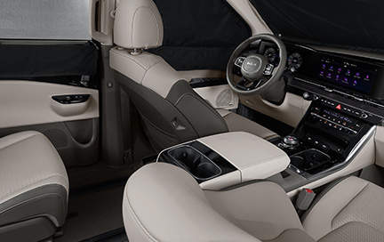 기아 카니발은 거대한 우주선에서 모티브를 얻어 디자인된 인테리어를 제공합니다. 시야는 넓고, 파노라마 디스플레이가 하이테크한 느낌을 줍니다.