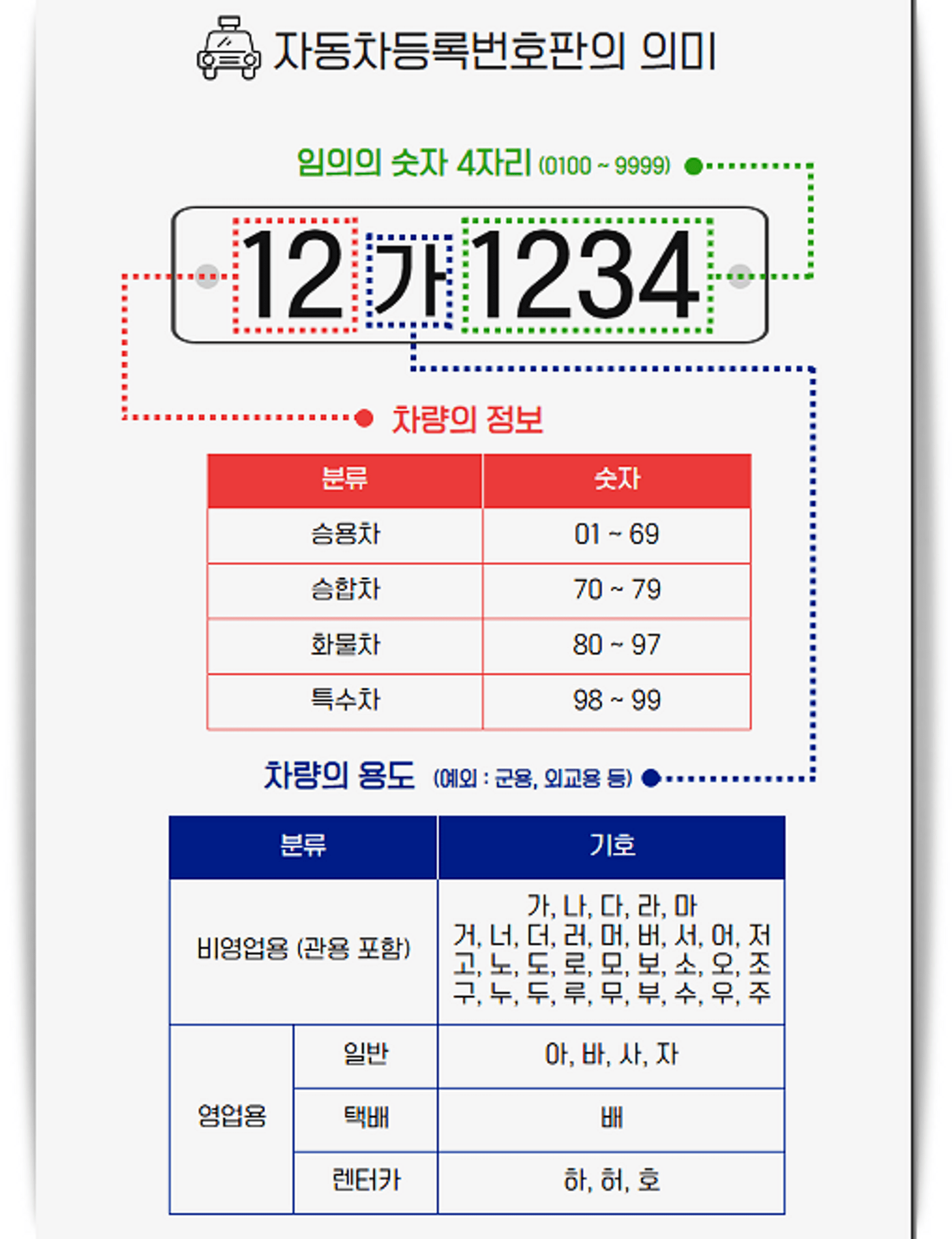 군용 차량의 경우 '육, 공, 해'로 표시가 되는데, 이는 각각 육군, 공군, 해군 및 해병대를 의미합니다. 택시의 경우는 '아, 바, 사, 자'로 표기되어 있습니다. 이런 식으로 번호판의 글씨를 통해 차량의 유형을 쉽게 파악할 수 있습니다.