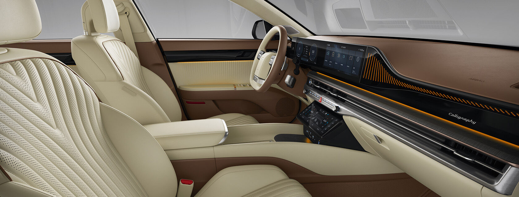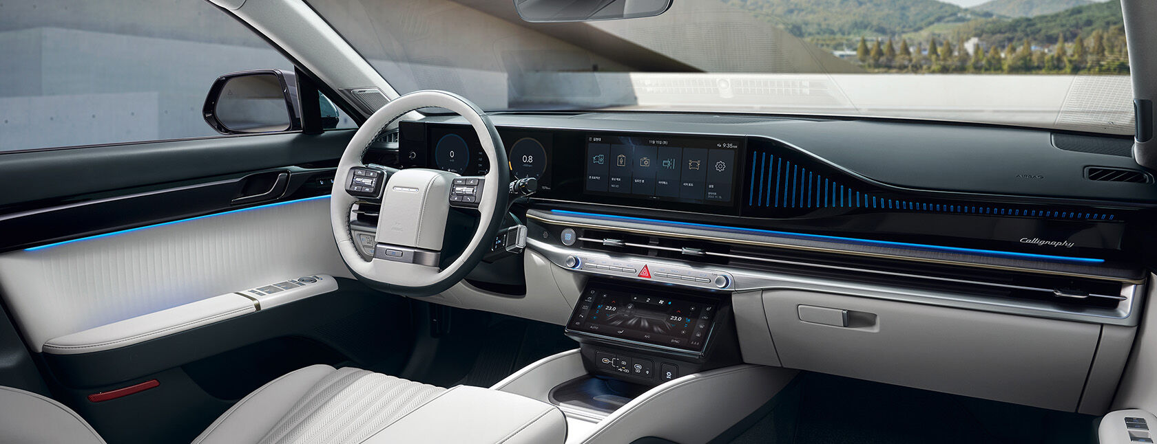 넓은 실내 공간과 고급 소재를 사용한 인테리어는 프리미엄 세단의 면모를 잘 보여줍니다. K Car의 상세 리뷰에서도 언급되었듯이, 캘리그래피 트림의 나파가죽 시트와 앰비언트 라이팅은 특별한 분위기를 연출합니다.