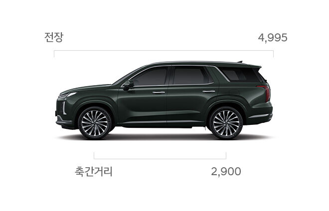 2025년형 팰리세이드는 대형 SUV 시장에서 독보적인 존재감을 자랑합니다. 전장 4,995mm, 전폭 1,975mm, 전고 1,750mm의 웅장한 차체를 자랑하는 팰리세이드는 넉넉한 실내 공간을 제공합니다. 현대자동차 공식 웹사이트에서 확인할 수 있듯이, 2,900mm의 긴 축간거리는 동급 최고 수준의 실내 거주성을 보장합니다.